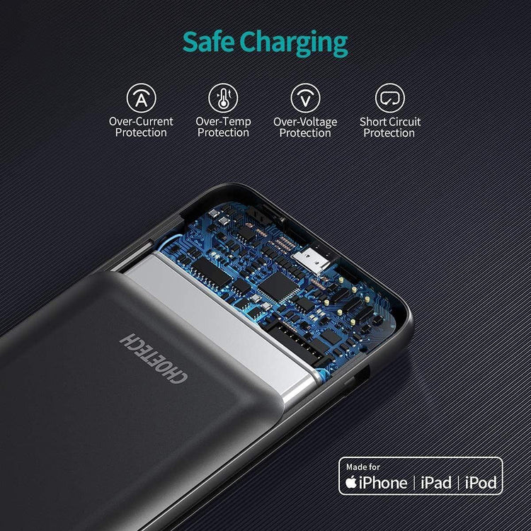 Choetech's power bank with two built-in cables - one MFi-certified PD18W Lightning cable and one QC3.0 18W USB-C cable allows you to charge two devices at the same time, providing enough power for iOS and Android phones and tablets. You don't need to take additional cables when you're on-the-go.