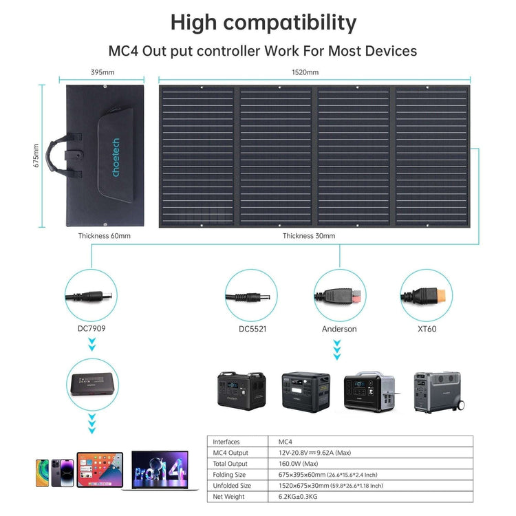 SpecificationInterface: 1 x DC, 1 x USB-C, 2 x USB-A Material: Oxford PVC fabric Water resistance IPX65 Monocrystalline silicon solar panel Total Output: 160W (Max) DC Output: 12-20V= 5A (Max) USB-A1 Output: 5V=3A, 9V=2A, 12V=1.5A (Max) USB-A2 Output: 5V=2.4A (Max) USB-C Output: 5V=3A, 9V=3A, 12V=3A, 15V=3A, 20V=2.25A (Max) Folded Size: 545 x 351 x 20mm Unfolded Size: 1965 x 545 x 4mm Net Weight: 6.6 KG