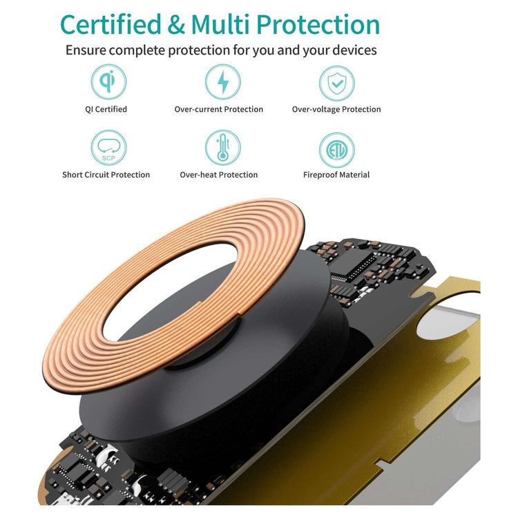 The Qi wireless charger works with QI enabled device like iPhone X/8/8 Plus, iPhone XS/iPhone XS Max/iPhone XR, Samsung Galaxy S9/Note 9/Note 8/S8/S8+/S7/S7 Edge/Note 5/S6/S6 Edge/S6 Edge Plus and other Qi-Enabled devices, Multi protection system for all-around protection against over-charging, over-voltage, over temperature and over-current, provide a safe charge to protect your devices.