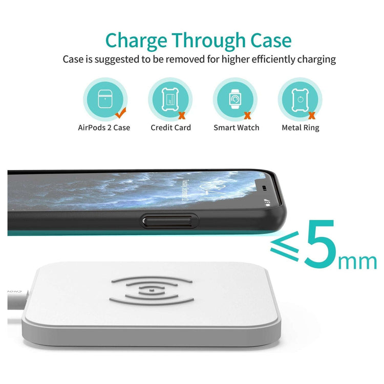 Our wireless charger can identify your phone sensitively and support phone case within 5mm(0.2 inches) while 4mm(0.16 inch) is the best wireless charging distance (Please note that metal attachments or credit cards will interfere with charging ).