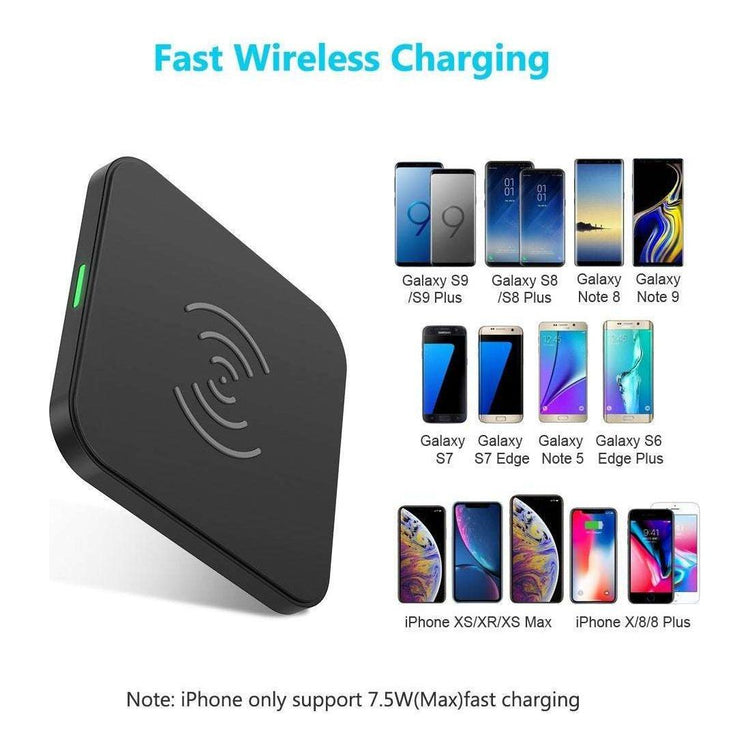 Fast wireless charge up to 10W for the Samsung Galaxy S9, S9 Plus, S8, S8 Plus, Note 9, Note 8, S7, S7 Edge, S6 Edge+, 7.5W wireless charging for iPhone X/ XS / XS Max/ XR/ 8/ 8 Plus ( QC2.0/3.0 adapter needed for fast charge) and 5W standard wireless charge for all Qi-enabled Phones.