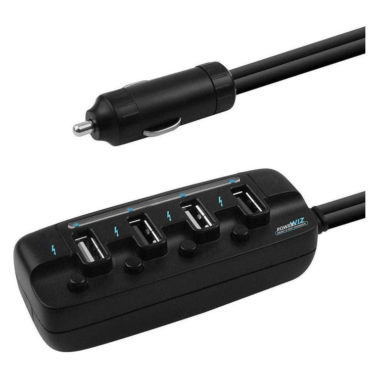 `- 4-Port 40W Rapid Car Charger with ON/OFF Switches - PowerWiz technology auto-detects your devices - Individual power ON/OFF function design - Delivers quickest possible charge for iPad, iPhone, Android phone or tablet.