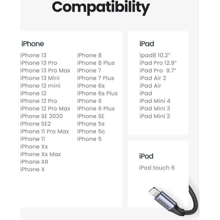 UGREEN iPhone Charger cable compatible with iPhone 14 Pro Max/14 Pro/14 Plus/14, iPhone 13 Pro Max/13/13 mini, New ipad 9, iPhone 12 mini/12/12 Pro Max, iPhone 11 Pro Max, iPhone XS Max/ XR/ X/ 8/ 8 Plus/ 7 plus/ 7/ 6s Plus/ 6s/ 6 Plus/ 6/ iPad Air/ iPad mini/ iPad Pro/ iPod Touch/ iPod nano 7th gen/AirPods, and more.