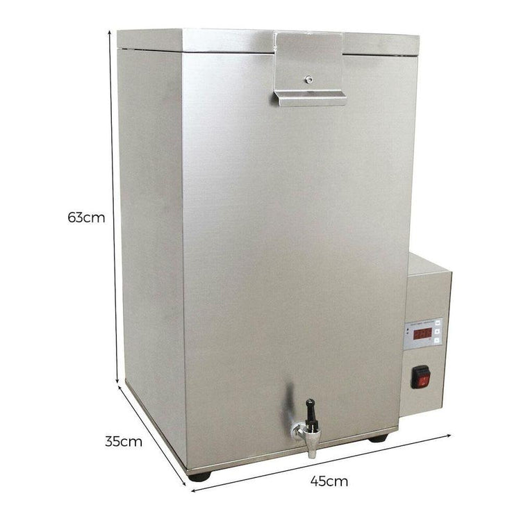 70 Litre Stainless Steel Poultry Scalder with drain basket, tap, thermostat and display screen for temperature control.