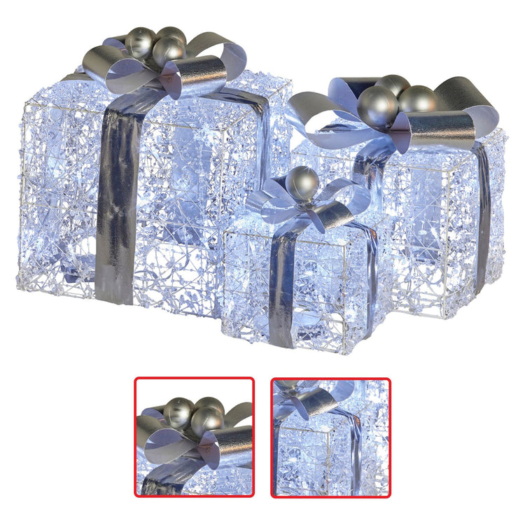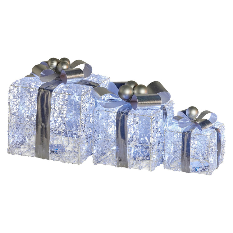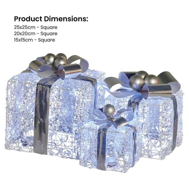 Feel the holiday vibes with this enchanting set of 3 Christmas gift box displays! These boxes are perfect for sprucing up your indoor space, complete with 60 cosy warm white LED lights, jewelled wire, and bold silver bows. Each box has its battery compartment, so you can place them wherever you want hassle-free. Add a sprinkle of magic to your holiday decorations with these beautifully illuminated gift boxes!