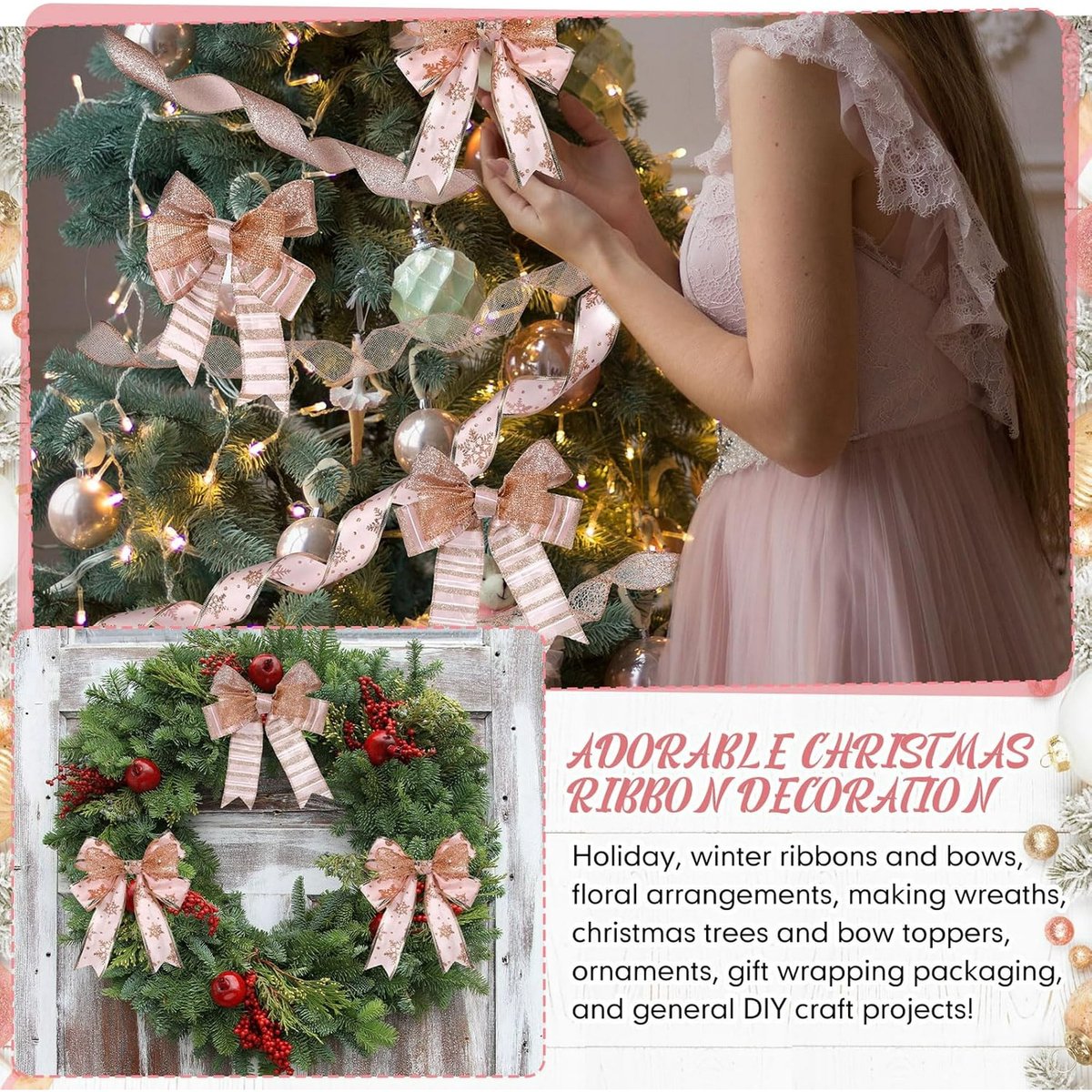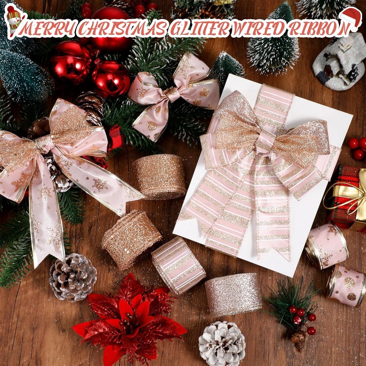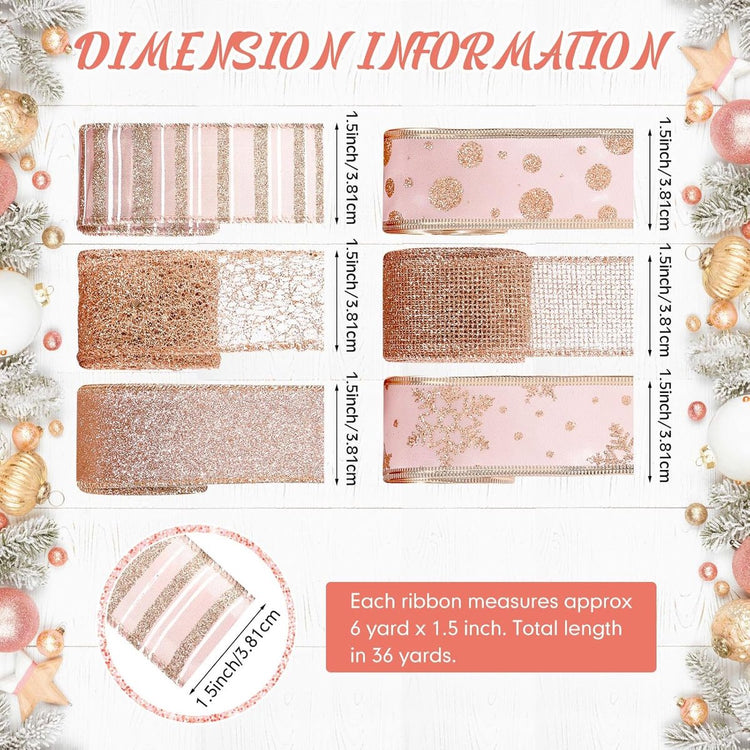 Elegant Crafts in Large Quantities: Embrace the Christmas spirit with our set of 6 Christmas ribbons; this quantity ensures you have plenty of stock for your festive decorations and won't run out mid-project. Aesthetically Appealing Rose Gold Shade: Our wired Christmas ribbon expertly embraces an elegant rose gold shade, including mesh, sequin, glitter, swirl, and snowflake satin styles. This is not only attractive but also complements most Christmas decor themes. The color adds a subtle touch of elegance to decorations and emphasizes the attention to detail. Reliable Quality: The rose gold ribbon is made of high-quality polyester with metallic wire edges; this ensures they retain their shape and glittery appearance throughout the season and can be reused in the future, making them a great addition to your Christmas decor arsenal. Show More