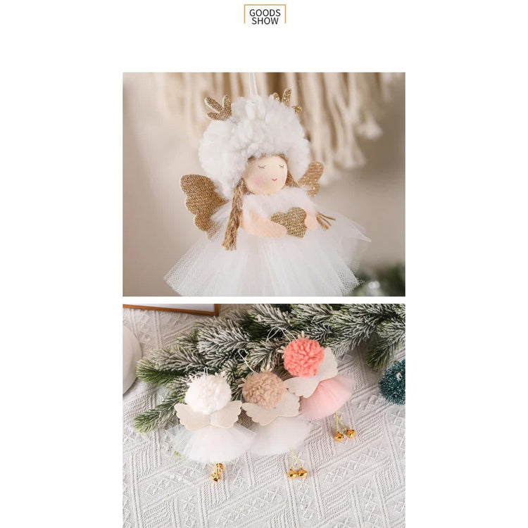 Bring a delicate sparkle to your holiday decor with this Gold and White Angel Ornament. Featuring soft golden wings, a fluffy headpiece, and gold bells as feet, this angel adds a touch of whimsical elegance to your Christmas tree. The angel holds a glittery snowflake, symbolizing the joy of the winter season. Perfect for hanging on trees, wreaths, or around the house for a magical festive atmosphere.