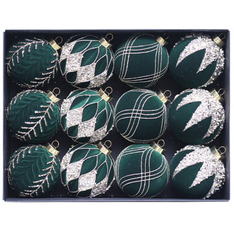 Green 12-Piece 8cm Christmas Bauble Set - Colorful Flocked Tree Ornaments