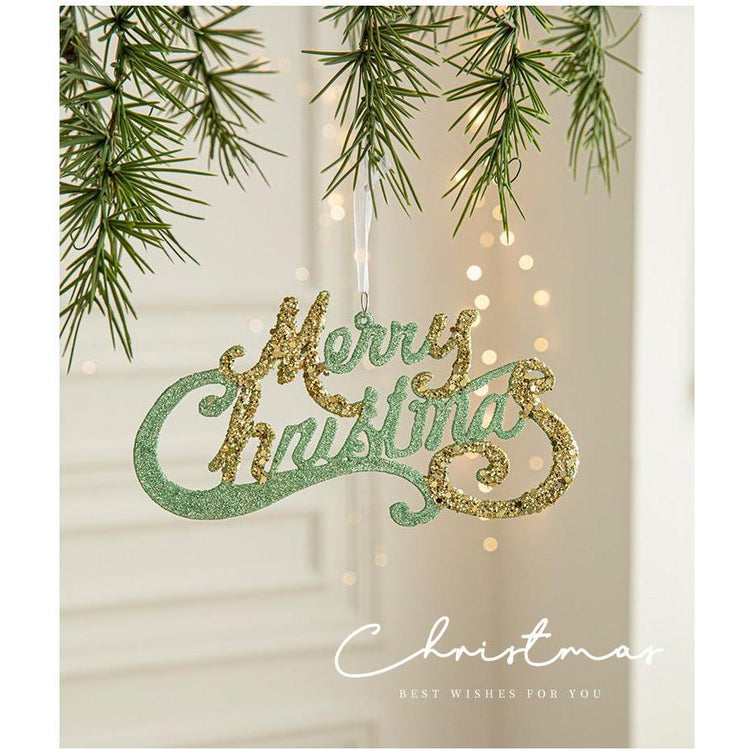 Green and Gold Glitter Merry Christmas Ornament - Brighten your holiday décor with this elegant hanging ornament featuring the words "Merry Christmas" in shimmering green and gold glitter. This lightweight and stylish decoration is perfect for Christmas trees, wreaths, or garlands.