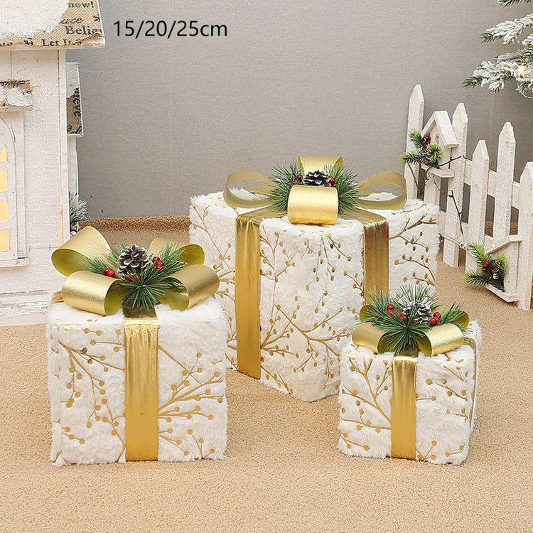 Elevate your holiday decor with this exquisite set of 3 decorative Christmas gift boxes featuring luxurious gold ribbons, pine cones, and red berries. Each box is elegantly wrapped in a plush, white fabric with golden accents, measuring 15cm, 20cm, and 25cm, to create a sophisticated holiday atmosphere. Ideal for under the Christmas tree, on mantels, or as part of your indoor festive display, these gift boxes add a touch of elegance and warmth to any space.