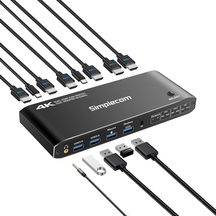 Simplecom KM430 Dual HDMI Monitor KVM Switch for 2 Computers with 4-Port USB Hub 4K@60Hz Keyboard Hotkey