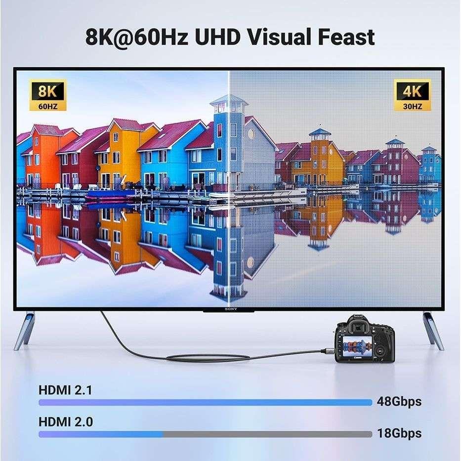 This Mini HDMI to HDMI Cable can expand the bandwidth up to 48Gbps, HDMI 2.1 version supports refresh rate up to 8K@60Hz, resolution up to 7680 x 4320, 33.18 million PX and 120FPS. It can make your large-screen cinema quality and sound quality can be output freely. (Note: 8K video requires an 8K source and output display. You need to make sure that your TV, graphics card or other equipment matches all HDMI 2.1 features.)