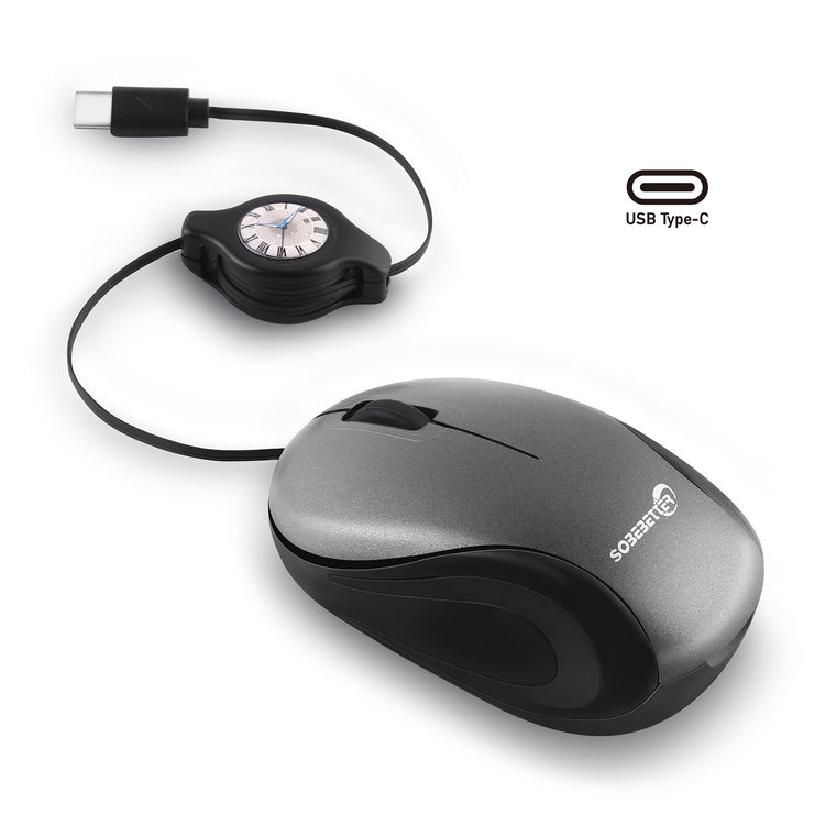 Grey and Black Portable Mini USB-C Mouse with Retractable Cable - Silent Click Travel Mouse for Laptop, MacBook, Tablet