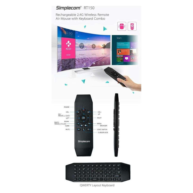 RT150 is a universal 2.4G wireless remote control with the combination of air mouse, keyboard, and motion sensing support. It converts your space movement in the air into an accurate movement on the screen, allows mouse to be controlled accurately. It’s a unique and capable tool to operate PC, Android TV Box, and more. Built-in rechargeable Lithium battery with auto sleep function, will last for several weeks on a single charge.