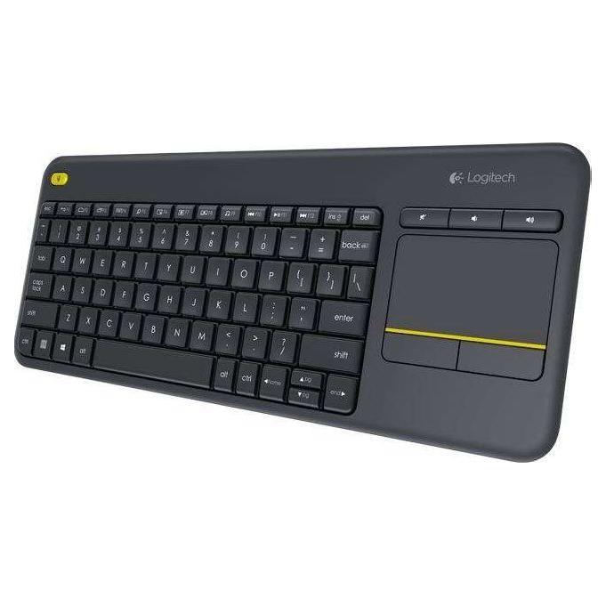 Logitech K400 Plus Wireless Keyboard with Touchpad & Entertainment Media Keys Tiny USB Unifying receiver for HTPC connected TVs Designed for laid-back control Integrated wireless keyboard with touchpad 10-meter (33-foot) wireless range Media-friendly TV keyboard You are instantly comfortable using the K400 Plus. Layout is designed for relaxed media interaction. Easy-access volume controls and arrow keys. Second left-click button lets you navigate and make selections with two hands. Shortcuts for Windows and Android¢ users. Hot keys work right from the box; no configuration Plug-and-play setup Setting up K400 Plus is a snap. Plug the tiny Unifying receiver into a USB port and start the fun.Use the keyboard receiver to connect up to six Unifying devices to your computer. Learn more and download Unifying software 18-month battery life You might forget this keyboard needs batteries. Virtually eliminates the hassle of replacing batteries. Use the on/off switch to extend battery life even further. Battery life was independently tested for two-hour use per day. Actual battery life will vary with use, settings and environmental conditions. Works with multiple operating systems Designed for use with Windows 7, Windows 8, Windows 10 and later, Android¢ 5.0 or later, and Chrome OS¢. Customizable control Use K400 Plus right from the box, or personalize key and touchpad settings with Logitech Options¢ software. System Requirements OS/Platform Support Windows 7, Windows 8, Windows 10 or later Android¢ 5.0 or later Chrome OS¢ USB port Dimensions SEE VISUAL Overall Height: 139.9 mm (5.5 in) Width: 354.3 mm (14.0 in) Depth: 23.5 mm (1.0 in) Weight: 390g (with batteries) Touchpad Height: 76 mm (3.0 in ) Width: 47 mm (2.0 in) Warranty Information 1-Year Limited Hardware Warranty Package Contents Wireless Touch Keyboard Unifying receiver 2 AA batteries (pre-installed) User documentation Technical Specifications