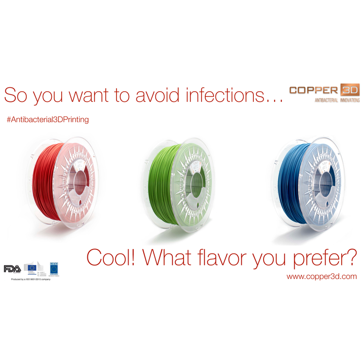 Copper 3D PLActive is an innovative Nanocomposite 3D printer filament developed with proven high-quality EasyFil PLA compound and a patented, scientifically validated and highly effective Nano-Copper additive. PLActive filament is FDA registered and eliminates more than 99.99% of fungi, viruses, bacteria and a wide range of microorganisms.