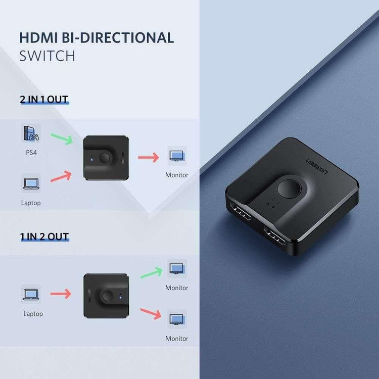Bi-Directional Splitter: HDMI switch has two modes. 2 in 1 out means that two devices are connected to one display. 1 in 2 out means that one device is connected to two displays (Two displays CANNOT be displayed simultaneously).