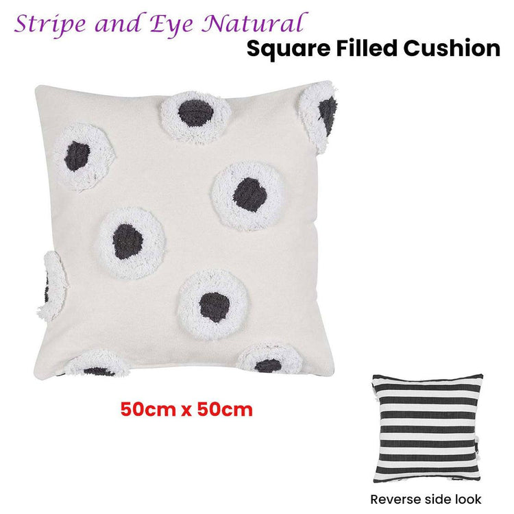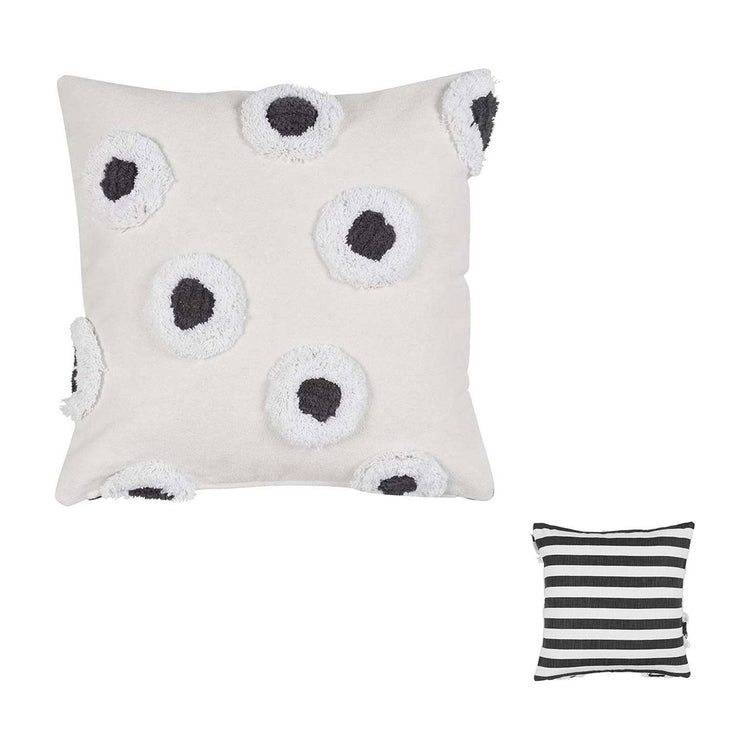The cushion Stripe and Eye Natural Square Filled Cushion 50cm x 50cm by VTWonen has a print of dots and stripes. The front of the cushion features a print of hand-painted black and white dots against a cream-colored background. The back of the cushion features a print of horizontal black and white stripes. Made from quality cotton fabric and polyester filling.