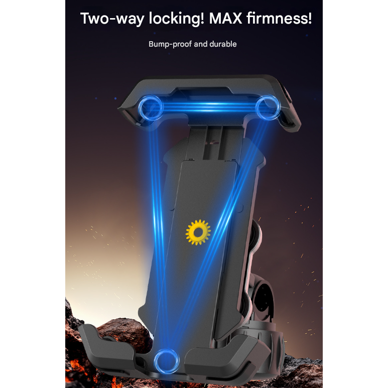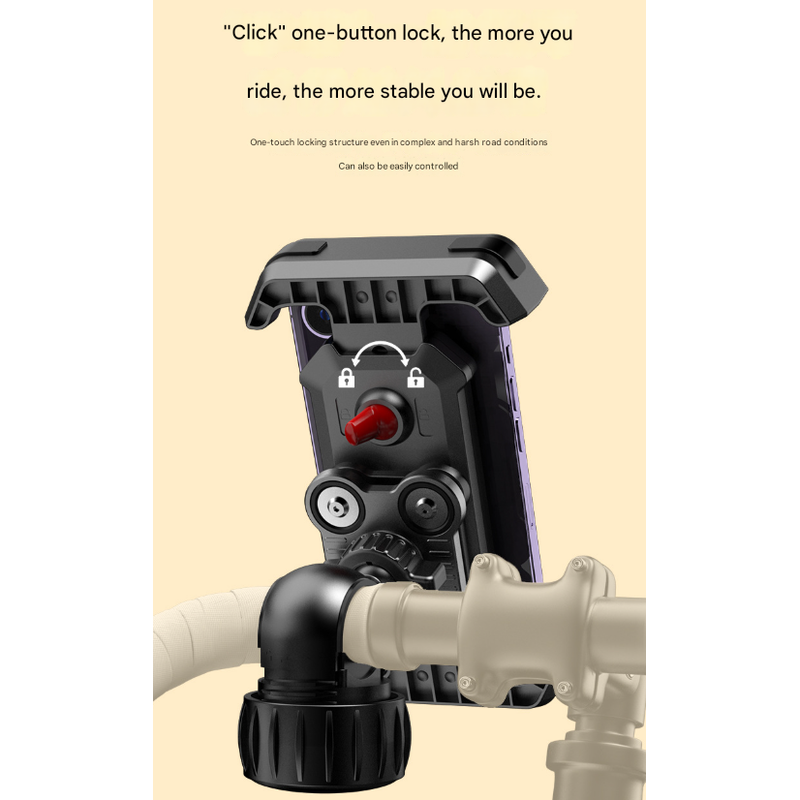 - One-Key Secure Lock: Forget flimsy grips. This mount features a robust mechanical lock that you can engage with a simple switch. Once locked, your phone is securely fixed, preventing any accidental drops even on the bumpiest terrain.