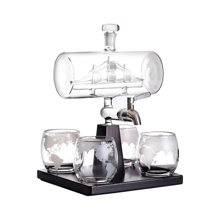 1L Whiskey or Wine Sailboat Glass Decanter Set - 4x Globe Glasses + Wooden Stand