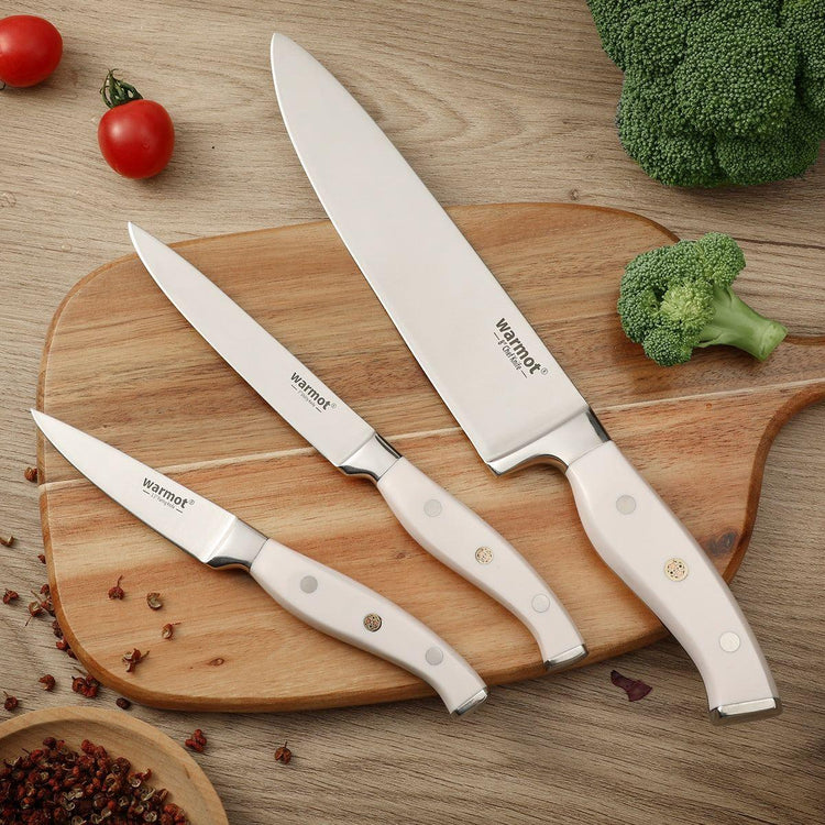 Color: 3-Pcs White Handle Brand: warmot Blade Material: German 1.4116 Stainless Steel Blade Edge: Plain Style: Ergonomic 8-inch Chef knife × 1 5-inch Utility knife × 1 3.5-inch Paring knife × 1