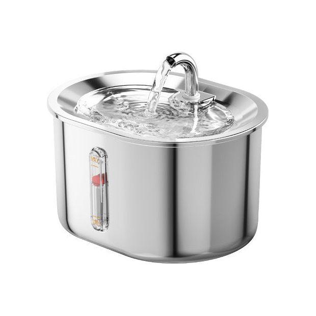 Intelligent Sensing Stainless Steel Pet Water Fountain featuring a smart sensor for automatic water flow when your pet approaches. This sleek stainless steel water fountain ensures clean water for your pet and includes a USB interface with a certified plug for easy and efficient operation. The package also comes with a filter element and filter cotton to maintain water quality, with a recommendation to replace the filter every month for optimal performance.
