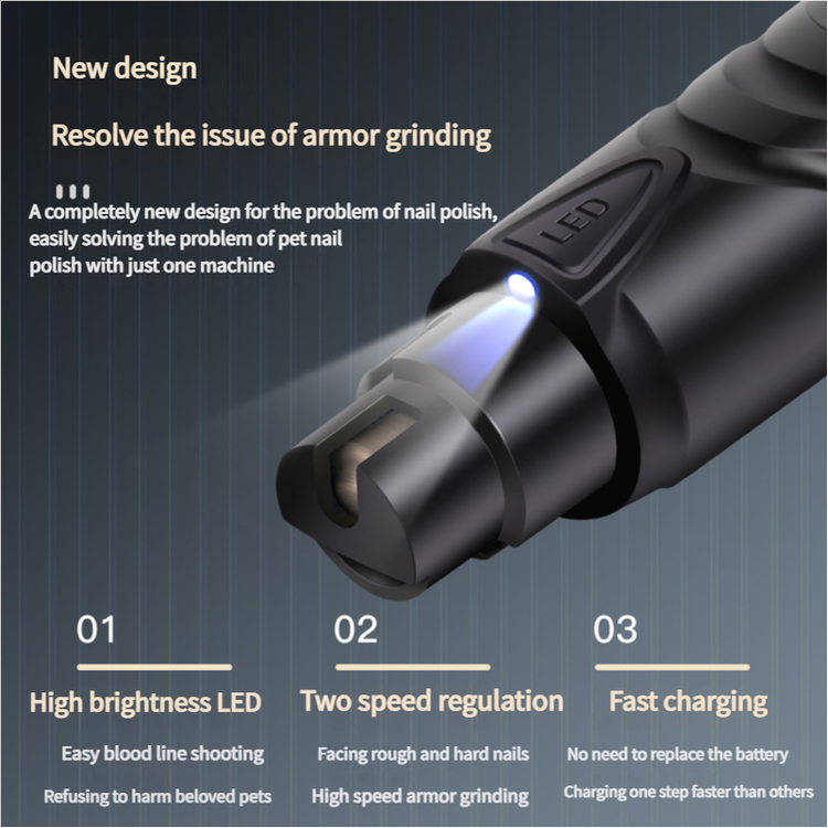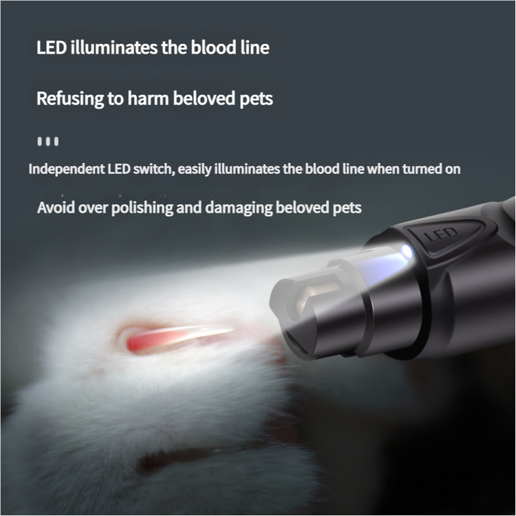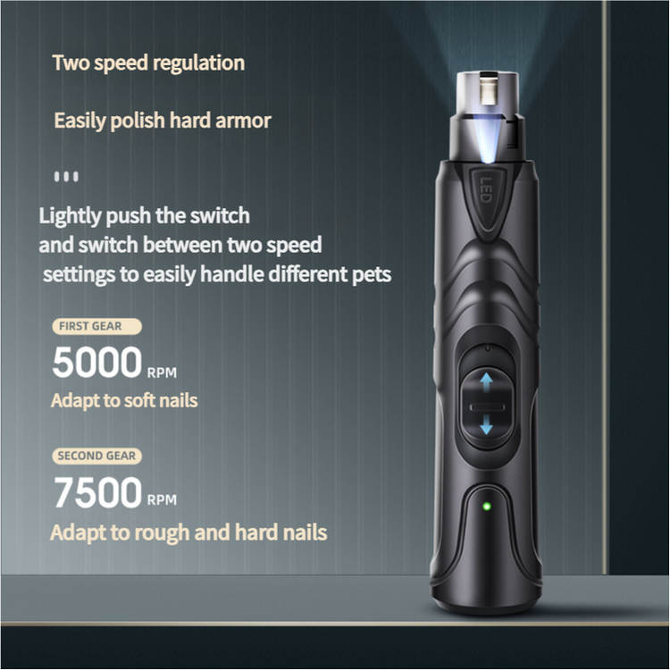 Product Description: This dual-speed pet nail grinder features an LED light for precise grooming and two speed settings (5000 RPM for soft nails, 7500 RPM for hard nails), providing a safe and painless experience for your pets. Ideal for dogs and cats, this grinder includes a rechargeable USB battery, ensuring long-lasting performance and convenience. The quiet operation makes it perfect for pets sensitive to noise. Designed with safety in mind, it reduces the risk of over-grinding while keeping your pet comfortable during grooming sessions.