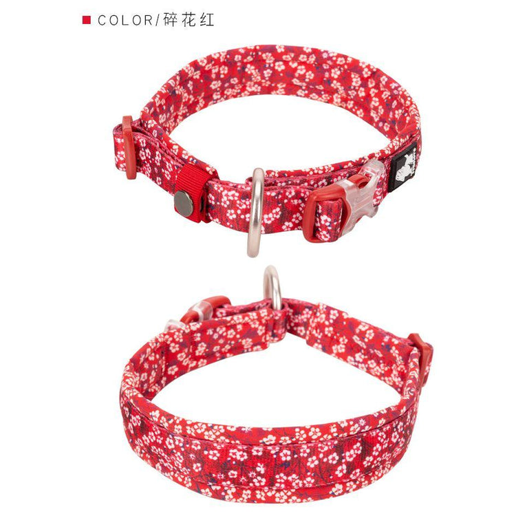 Floral doggie collar. This stylish Dog collar is padded and super comfortable. It can be accessorised with the matching lead and harness. Easy to secure with a durable snap buckle. Easy to put and take off with. Features an O ring for secure leash attachment.