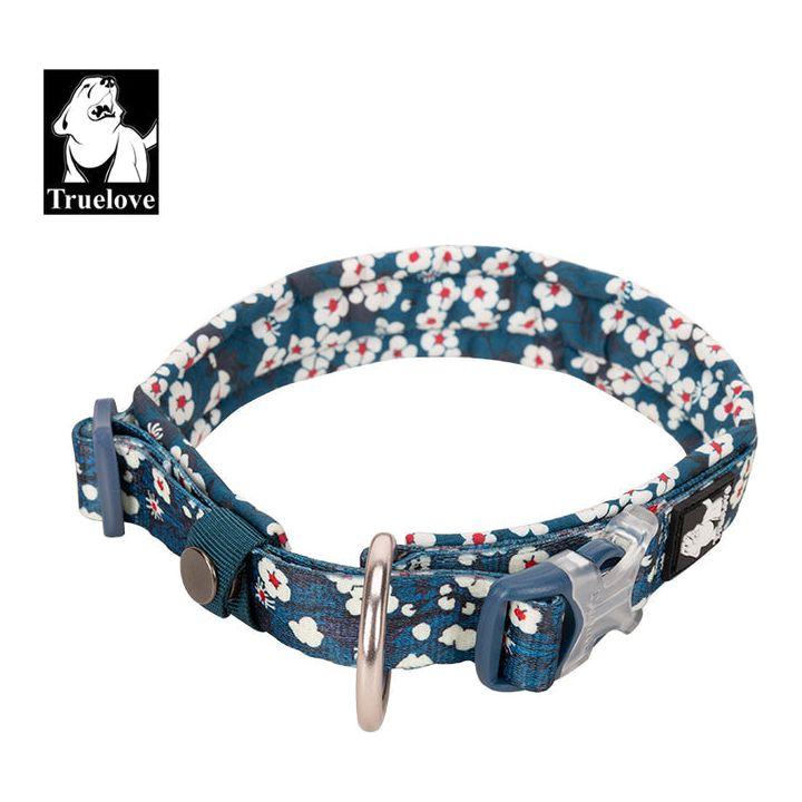 Floral doggie collar. This stylish Dog collar is padded and super comfortable. It can be accessorised with the matching lead and harness. Easy to secure with a durable snap buckle. Easy to put and take off with. Features an O ring for secure leash attachment.
