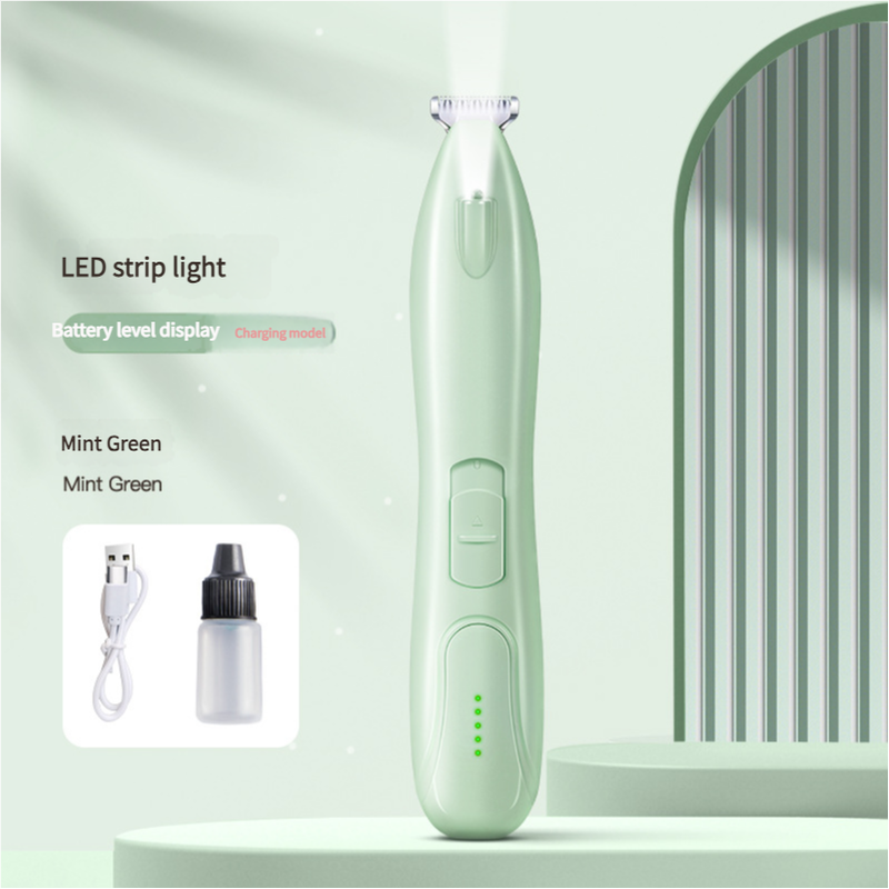 Product Description: This Mint Green pet hair trimmer is designed for precision grooming with an LED strip light that illuminates hard-to-see areas. It comes equipped with a USB rechargeable battery and a battery level display for easy monitoring. The sharp stainless steel blade ensures smooth trimming, while the ergonomic handle provides a comfortable grip during use. This versatile trimmer is ideal for grooming sensitive areas like the paws, face, and ears. Perfect for all pet sizes, this tool makes at-home grooming easy and convenient.