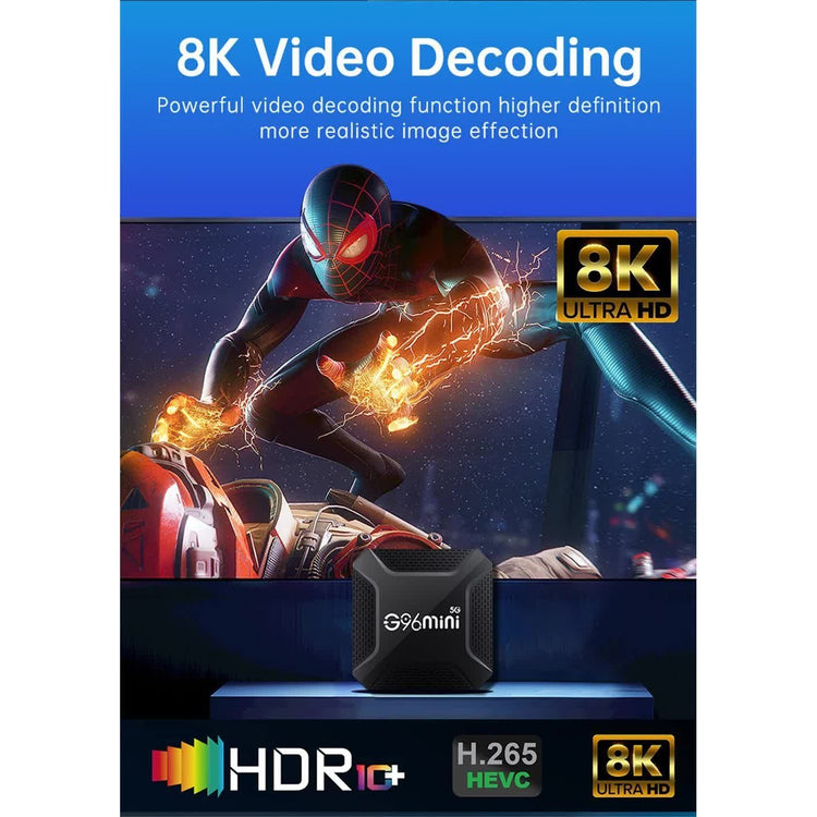The G96mini 5G Android TV Box transforms your TV into a Smart TV, offering ultra-high-definition 8K streaming, powerful performance, and an easy-to-use interface. Ideal for users who want to enjoy a premium viewing experience without the hassle of cables and complex setups.