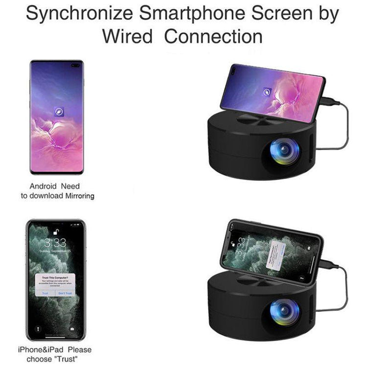 Experience seamless screen synchronization with the Portable Mini Projector. Compact yet powerful, this projector supports smartphone wired connection for both Android and iOS devices, enabling quick mirroring for movies, games, and presentations. Enjoy high compatibility with USB, HDMI, and audio outputs, making it the perfect gadget for home theater setups or professional use.
