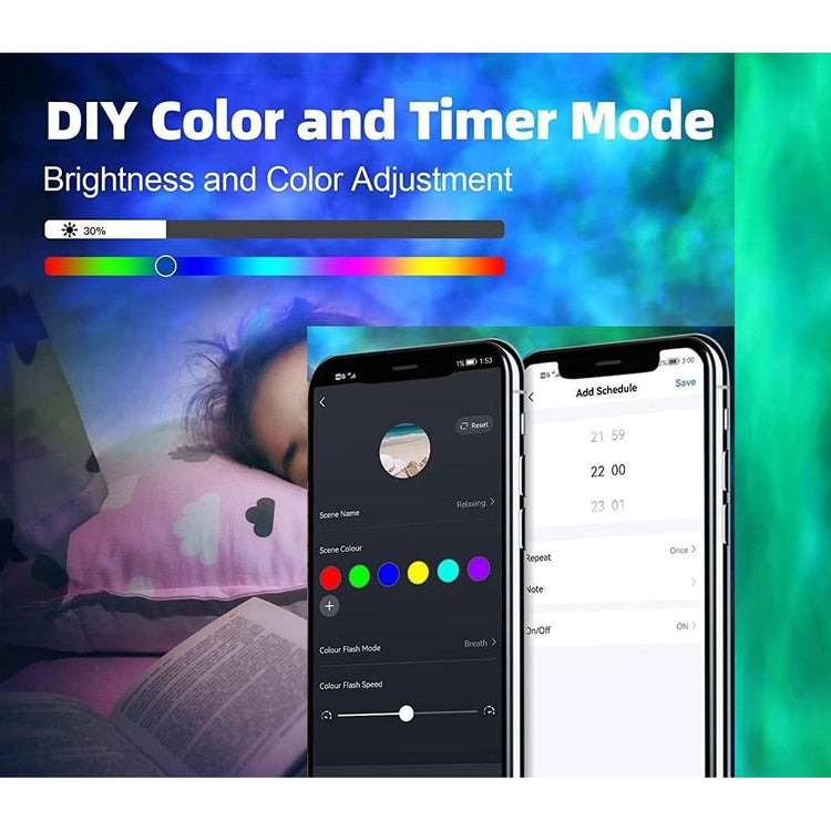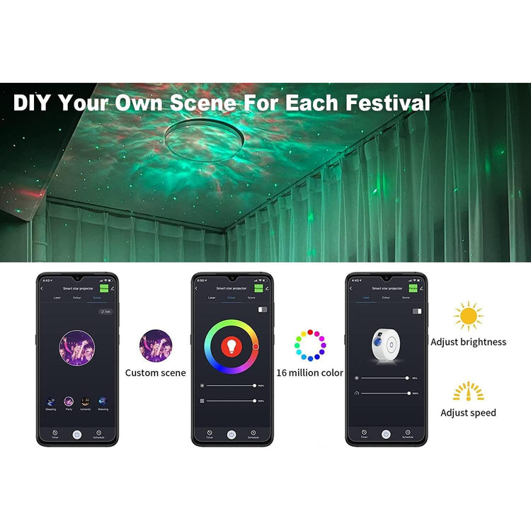 - The Smart Galaxy Projector offers maximum flexibility with its 24-hour built-in timer and 7-day scheduling capabilities. Plus, you can customize your lighting experience with 4 built-in scene modes and 16 million colors to choose from. Create your own unique lighting effects and enjoy them your way.