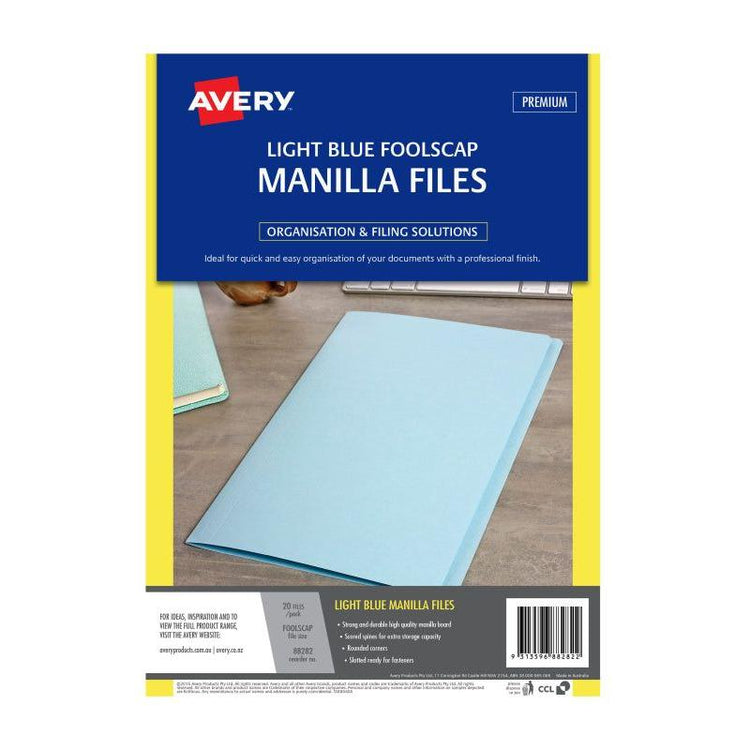 AVERY MANILLA FOLDER LIGHT BLUE FOOLSCAP PK20 OFFER THE HIGHEST QUALITY FROM A STRONG AND DURABLE MANILLA BOARD. IDEAL FOR PROJECTS OR PERSONAL FILES AND SUITABLE FOR COMPACT ARCHIVING INTO STORAGE SYSTEMS.