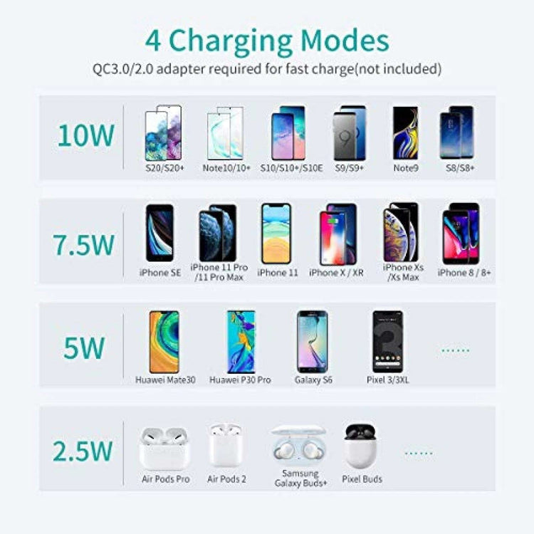 Compatible with Qi Certified smartphones. With 5W, 7.5W, 10W, three charging modes.