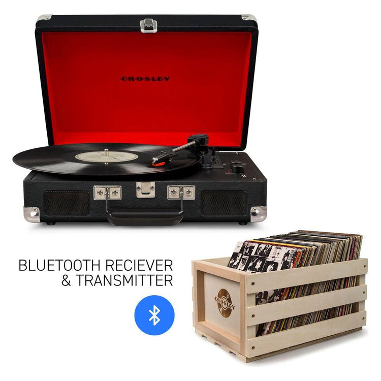 The one, the only, the original, Crosley Cruiser. Lightweight in its charming suitcase-style shell, its easy to use and a delight to hear. With pitch control, built-in speakers and NOW with Built-in Bluetooth receiver; stream your music via your phone to the improved stereo speakers of the turntable. Easily Switch to built-in Bluetooth transmitter and experience your records on your own wireless speakers or headphones. The Cruiser is ready to jam vinyl or your digital music. Choose from a rainbow of sound to start your vinyl adventure with this portable three-speed record player. Crosley Cruiser Bluetooth Portable Turntable - Portable Turntable, Belt Driven Turntable Mechanism, Plays 3 Speeds - 33 1/3, 45 And 78 RPM Records, Built-in Bluetooth Receiver and Bluetooth Transmitter (Connects to Bluetooth Speakers) , Auxiliary Input, Headphone Jack, RCA Audio Out, Adjustable Pitch Control, 6\" Full Range Speaker. Crosley Record Storage Crate Go crate-digging through your own collection with Crosleys rustic wooden record crate. Fire-branded with the iconic Crosley logo this lightweight crate gives plenty of room to fill it with precious LPs. Product Features Integrated Carry Handles Holds approximately 75 albums Finished In Solid Wood