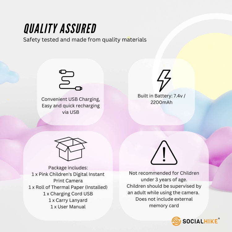 Looking for a fun and easy way to capture your child's unforgettable moments? Our Social Hike Kids Instant Print Camera is the perfect solution! Designed with young photographers in mind, this camera is packed with exciting features that make photography a breeze and tons of fun.