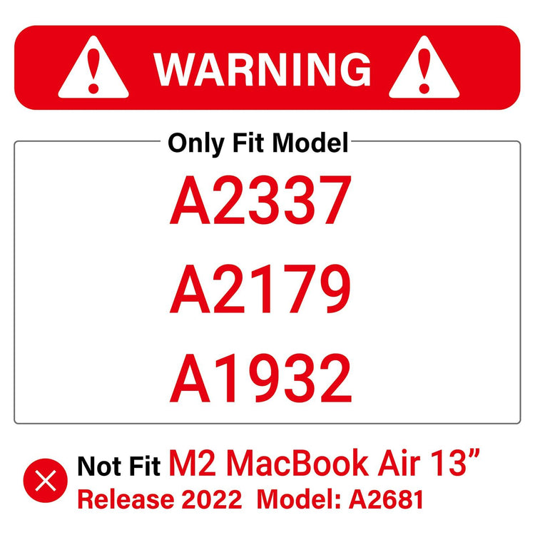 Not Fit - This case is NOT compatible with 2022 M2 MacBook Air 13 Inch (Model: A2681) and Older MacBook Air 13 Released BEFORE 2018 (Models: A1466/A1369). Please kindly check the model number at the bottom of your laptop "A****"