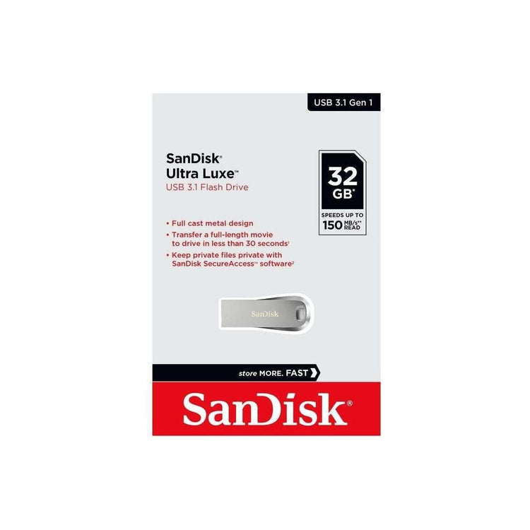 Combine the necessity for a convenient way to store and move your data with your desire for a protective, elegant device. The all-metal Ultra Luxe USB 3.1 flash drive delivers fast transfer speeds up to 150MB/s. Spend less time waiting to transfer a full-length movie to drive in less than 30 seconds. And with up to 256GB of space, its durable cast metal design holds all your important content in beautiful form. The Ultra Luxe flash drive has SanDisk SecureAccess password protection software built in, includes RescuePRO Deluxe file recovery software to help recover inadvertently lost or deleted files