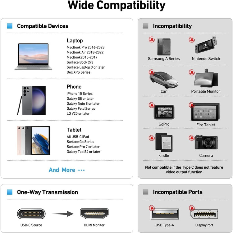The BENFEI USB-C to HDMI is compatible with iPhone 15 Pro/Max, 13/15 MacBook Pro/Air, iMac,2023,2022,2021, 2020, 2019, Google Chromebook Pixel, Yoga 900, Dell XPS 13 (9350), Dell XPS 15 9550, Dell XPS12 9250, DellPrecision 5510, HP Spectre X2, HP Spectre x360, HP Elitebook Folio G1, HP Elite x2 1012 G1, Acer Switch Alpha 1, Acer Spin 7, Acer Chromebook R13, Samsung Chromebook Plus, Samsung Galaxy TabPro S,Samsung Galaxy A7 2017, LG G5, LG V20, HTC 10