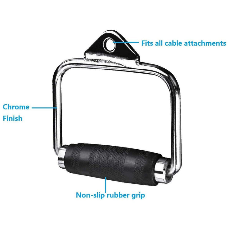 Made of solid steel,anti-rust, durable to use. High-polished chrome finished single handle for exercise cable attachment. Rubber handle for firm, safe and secure grip during workouts. Dimensions: about 12cm x 10cm