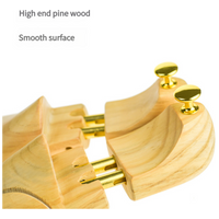 Adjustable shoe tree made from natural pine wood, suitable for sizes EUR 43-44. This premium shoe tree features brass knobs for easy handling and is crafted to maintain the shape of your shoes, reduce creases, and prolong their lifespan. The natural pine wood helps absorb moisture, keeping your shoes fresh and in perfect condition. Ideal for preserving the quality and comfort of your footwear.