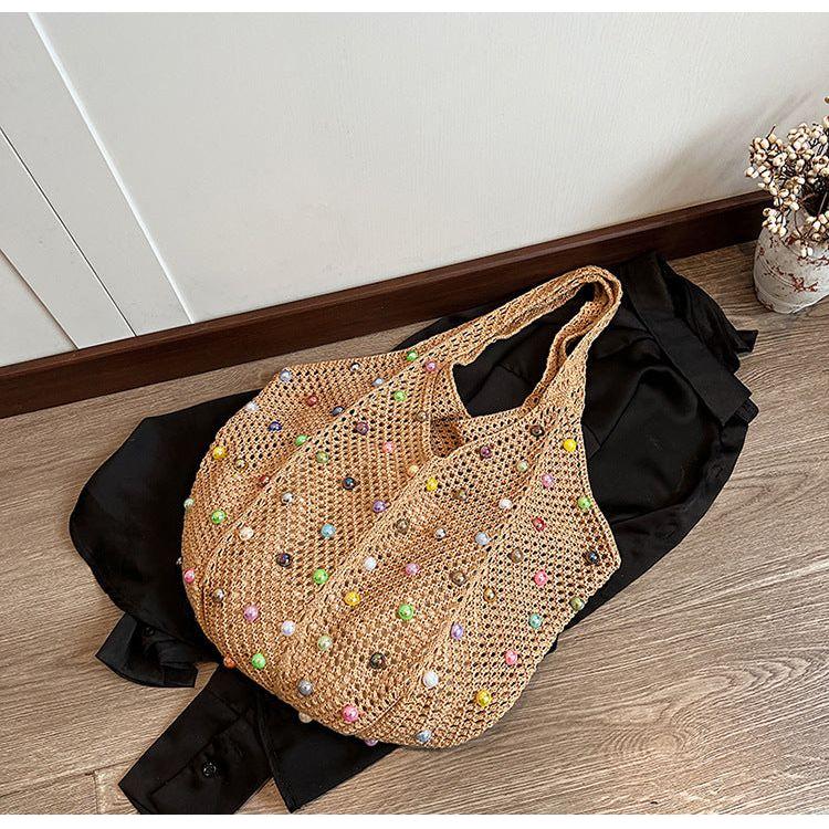 Summer Woven Handbag – Hollow Straw Beach Tote with Colorful Beads, Lazy Style, Large Capacity Shoulder Bag for Vacation