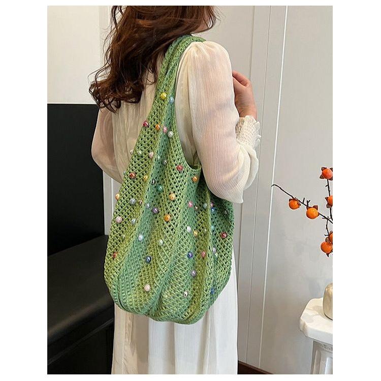 Summer Woven Handbag – Hollow Straw Beach Tote with Colorful Beads, Lazy Style, Large Capacity Shoulder Bag for Vacation