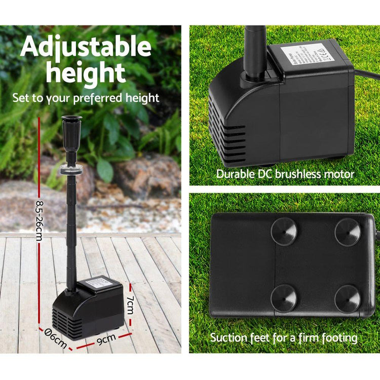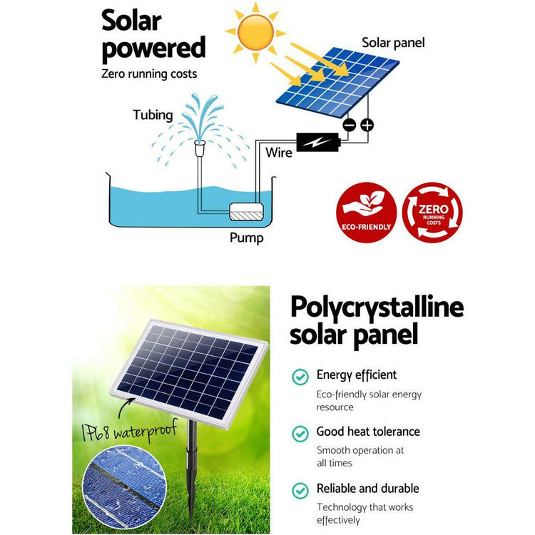 A joyous addition to your garden. Our Solar Powered Fountain can make your garden a simply stunning and mesmerizing place for everyone. Not least, with its energy drawn from the sun, your fountain is practically running at zero costs. And there is more to our fountain than just plain economics. Featuring a brushless DC pump, the fountain can pump up to 2m (6.6ft) high of dazzling water at a flow rate of 800 litres per hour. The solar panels are premium polycrystalline, which means that you get better energy conversion to run the fountain effortlessly. Better still, you can mount the solar panels anywhere within a 5m radius of the water feature. And with a rechargeable battery, the water show can go on much longer. The entire unit comes with all the necessary fittings and accessories for an easy, no-hassle set up.