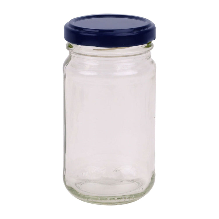 Empty 375ml Round Flint Glass Jars with black metal twist finish lids. Commonly used for food products, preserving, packaging, spices, wedding favours or vases due to their neck finish. The closure has a puff compound for high acid resistance and can be used for cold or hot fill, either hand or machine applied.