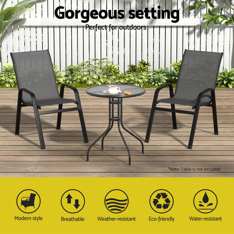 Whether you're hosting an outdoor intimate dinner party or barbeque night for your friends or family, the Gardeon outdoor stackable chair set is perfect to design a gorgeous outdoor setting that will wow your guests. The chairs are stackable, which makes for convenient and easy storage when not required. Designed for years of enjoyment, the chair set boasts classic looks and are made from premium textilene fabric and sturdy metal frame with durable powder coating. The anti-slip feet and good weather-resistance also makes them quite desirable. You can also pair this chair set with our sturdy and beautiful matching table to create a harmonious look.