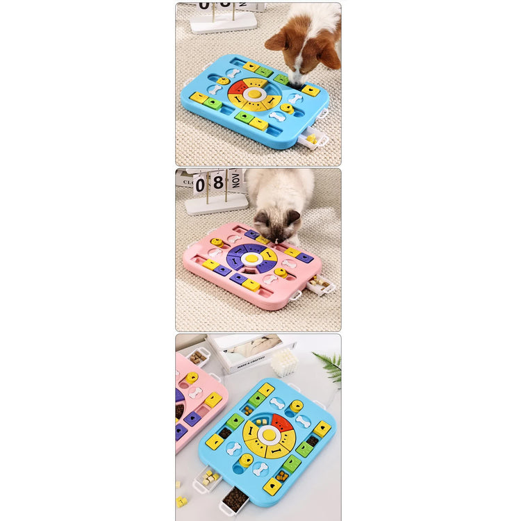 Challenge your dog or cat's mind and make feeding time more engaging with this advanced Interactive Puzzle Feeder Toy. Designed with multiple types of challenges, including sliders, rotating elements, and pull-out drawers, this toy provides excellent mental stimulation, slows down eating, and helps combat boredom by rewarding your pet's natural foraging instincts.