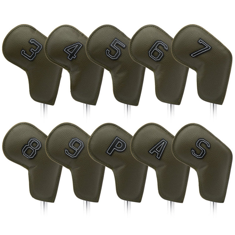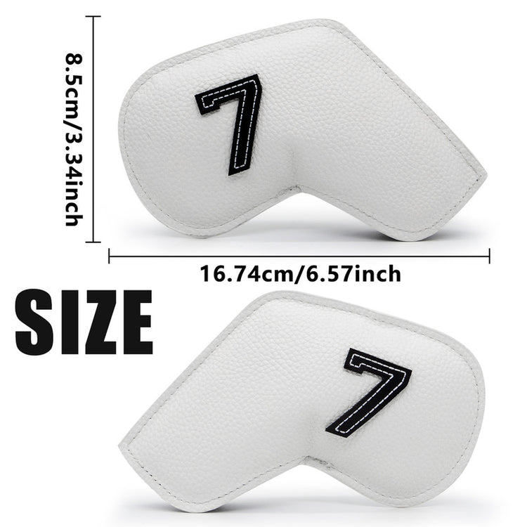 Protect your golf irons in style with this Set of 10 Golf Iron Head Covers. Crafted from premium PU leather, these covers are designed to shield your clubs from scratches, dings, and the elements. Featuring embroidered numbers (3-9, P, A, S) for easy identification, this set offers a perfect blend of functionality and elegance, making it an essential accessory for every golfer.