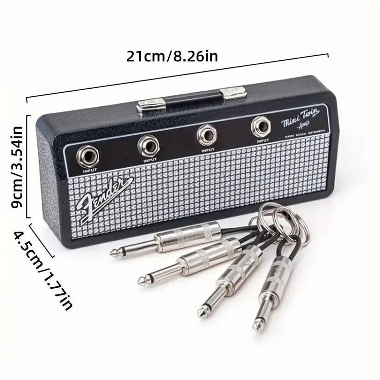 Add a touch of rock-and-roll flair to your home with this innovative wall-mounted key organiser. Designed to look like a mini guitar amplifier, this unique storage solution holds your keys in place with guitar plug keychains that fit perfectly into the amp-style jacks. Perfect for music lovers and anyone looking to add functionality and personality to their living space.